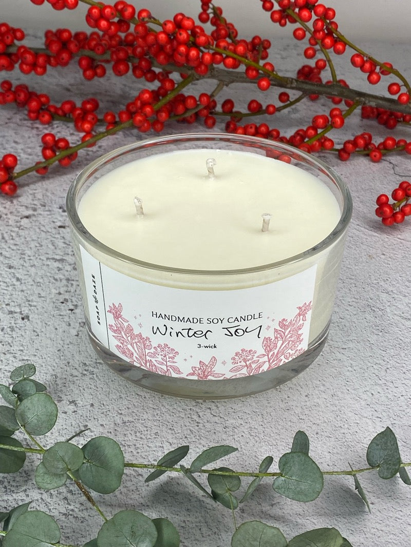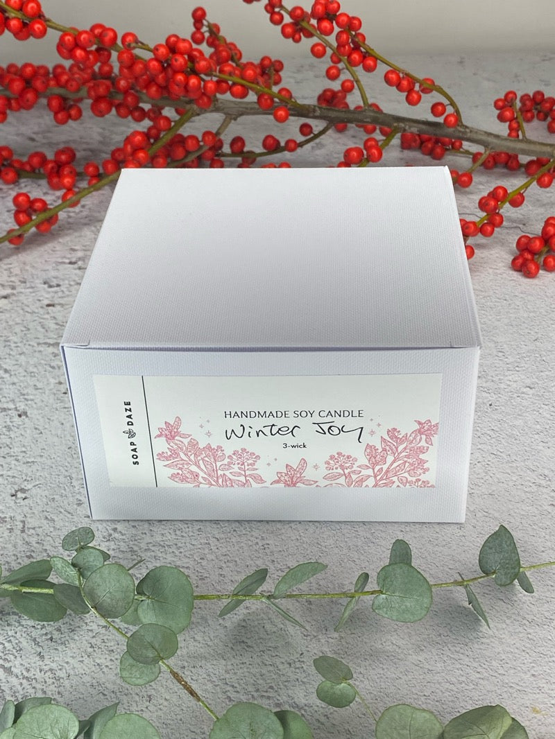 Our Winter Joy soy wax candles have been handcrafted by Sharon. Made in small batches, 2 at a time, and scented with rosewood and sandalwood essential oils. With white card gift box.